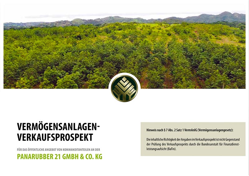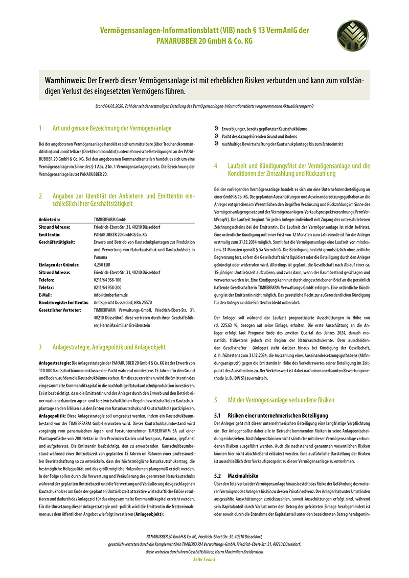 Der Anleger kann den veröffentlichten Vermögensanlagen-Verkaufsprospekt zu dieser Vermögensanlage und evtl. Nachträge hierzu sowie das Vermögensanlagen-Informationsblatt auf der Internetseite mail.mail.timberfarm.de abrufen und kostenlos bei der Anbieterin TIMBERFARM GmbH und/oder der Emittentin PANARUBBER 21 GmbH & Co. KG, beide Friedrich-Ebert-Str. 31, 40210 Düsseldorf anfordern.